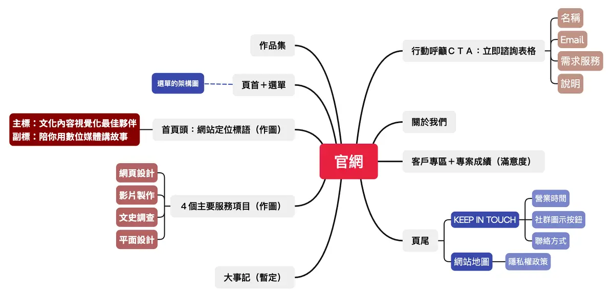 • 基本企業官網內容:首頁、關於我們(含品牌精神與故事、團隊與組織)、服務項目、最新消息(或企業新聞)、作品案例、聯絡資訊、服務流程。